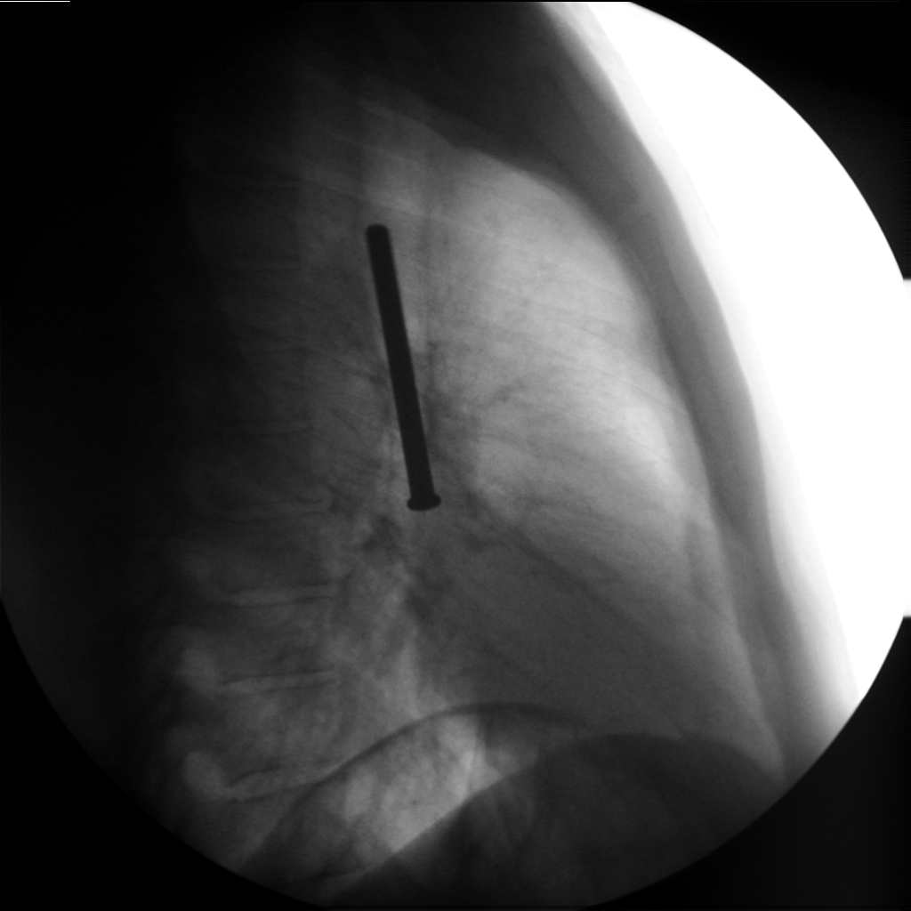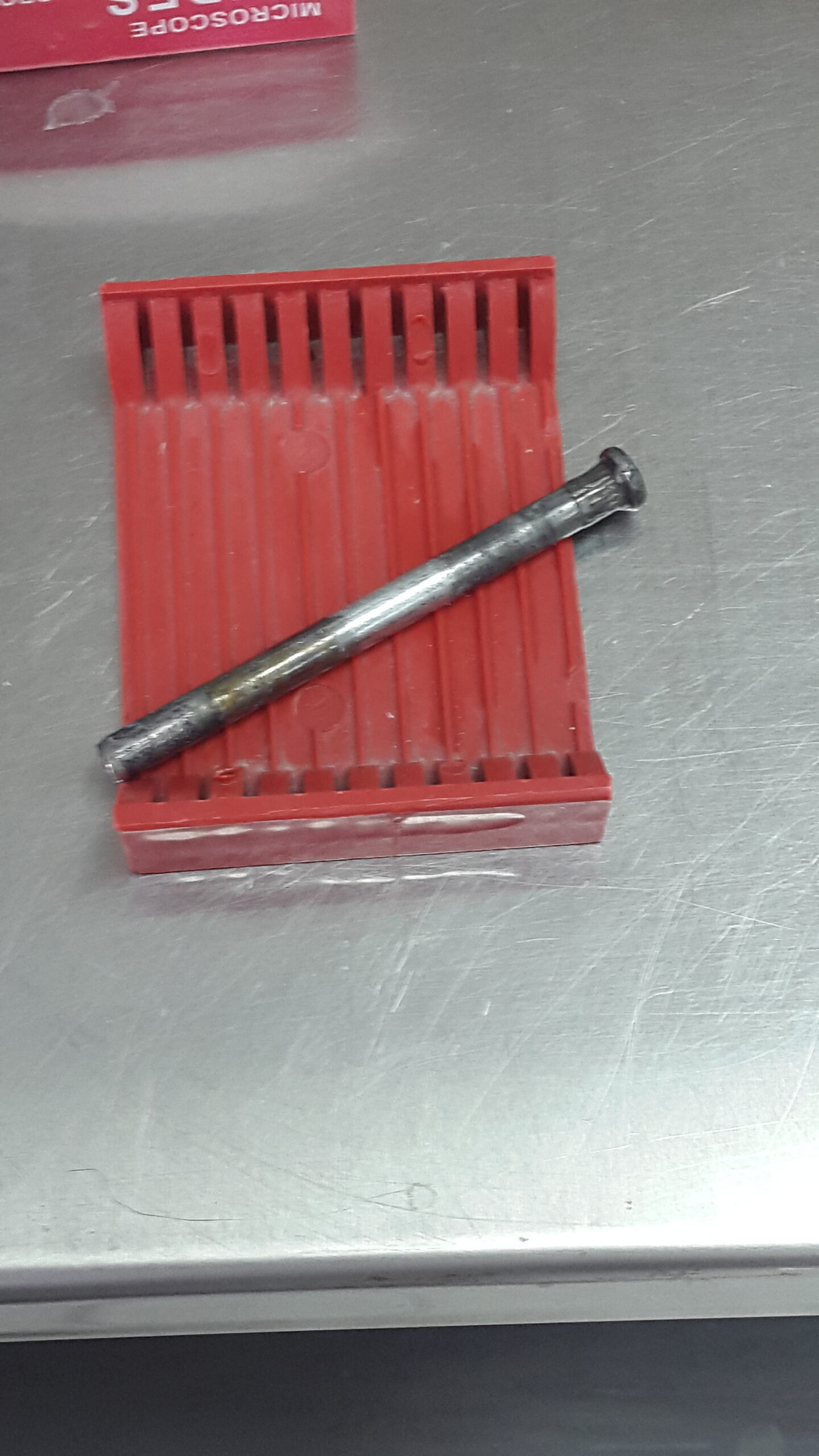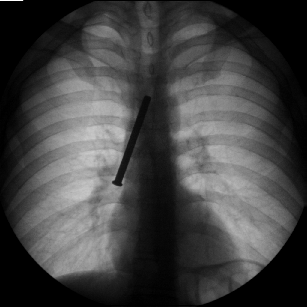 31 წლის პატიმარმა თვითდაზიანების მიზნით გადაყლაპა რამოდენიმე ნივთი, მათ შორის ერთი რკინის ნივთი გადასცდა, რის გამოც გაუძნელდა სუნთქვა, გაუჩნდა სტრიდორი, ძლიერი ტკივილი მარჯვენა გვერდში მოძრაობის დროს. საციცოცხლო ჩვენებით, ზოგადი გაუტკივარების პირობებში ჩატარდა რიგიდული ბრონქოსკოპია. გამოყენებული იყო ყველაზე დიდი ზომის ტუბუსი №13. ამოღების პროცესს ართულებდა უცხო სხეულის დიდი ზომა (სიგრძეში 10სმ). რამოდენიმე წარუმატებელი მცდელობის ბოლოს მოხერხდა უცხო სხეულის ექსტრაქცია. მანიპულაცია ჩატარდა გართულებების გარეშე.